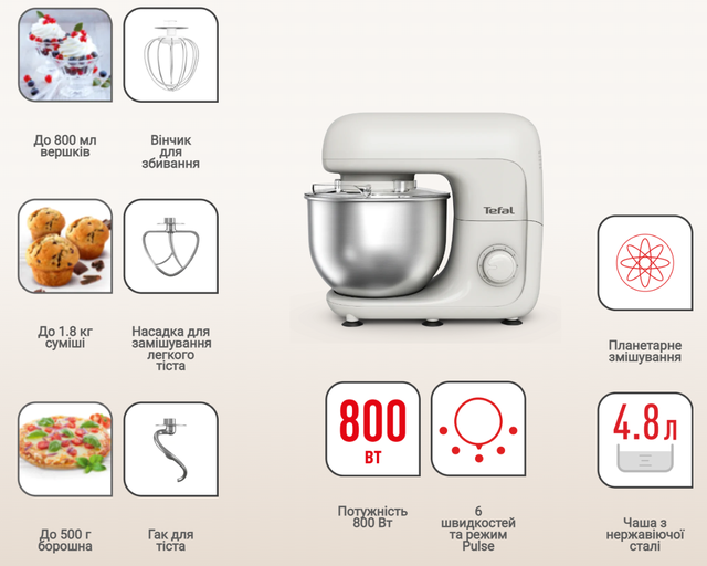 Ця кухонна машина - ваш універсальний помічник, якому під силу будь-які страви. Завдяки трьом насадкам, приготування ароматного хліба зі скоринкою, соковитої піци чи пишних тістечок стало ще простішим.
