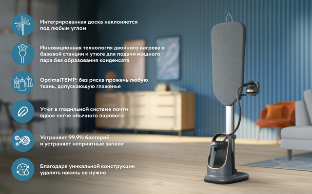 Окрім розгладжування складок, прасувальна система освіжає одяг, м’які меблі, штори та іграшки, а також усуває запахи, видаляючи до 99,9% бактерій.