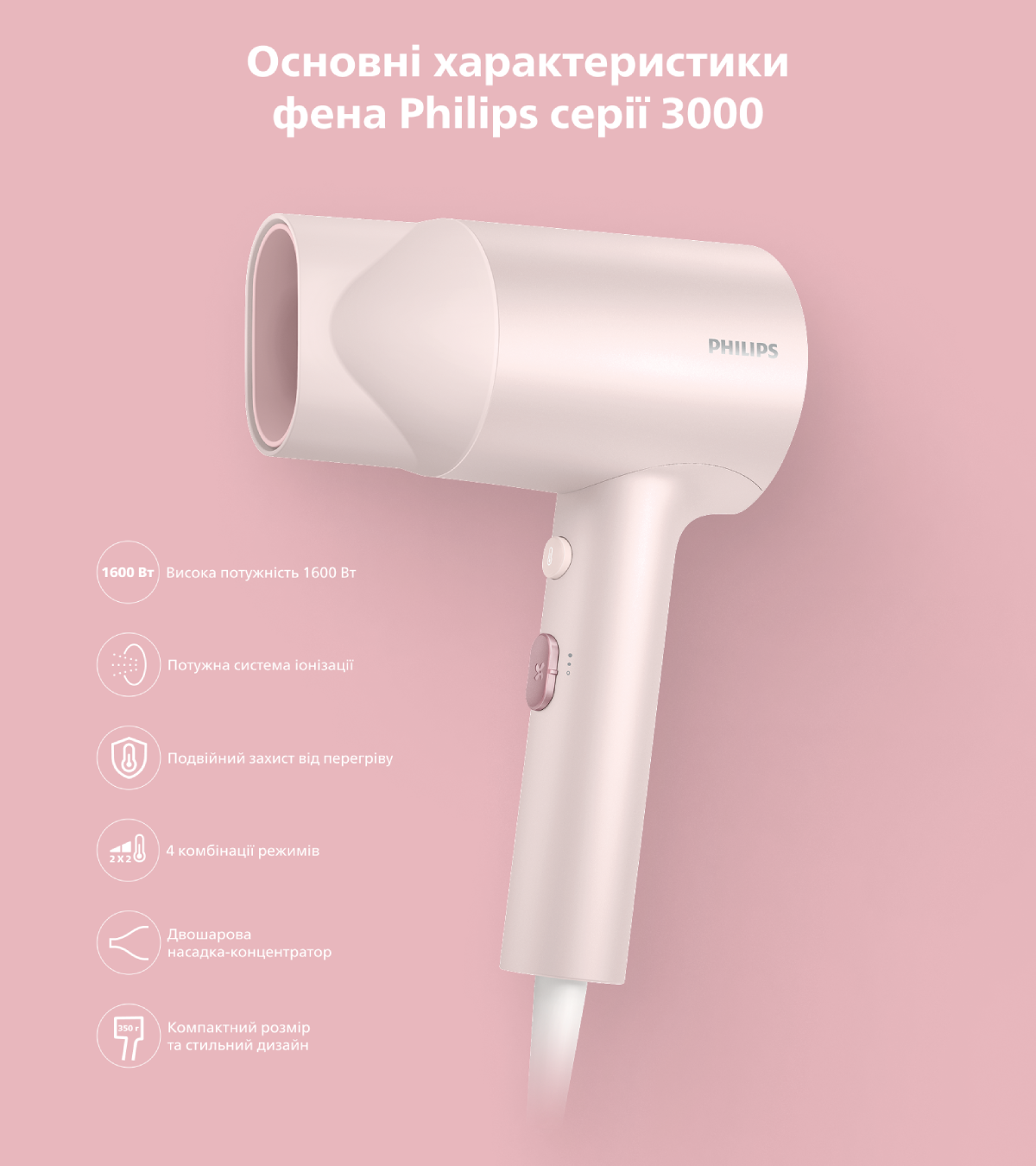 Фен Philips Series 3000 BHD321/50 Pink UA, фото 3