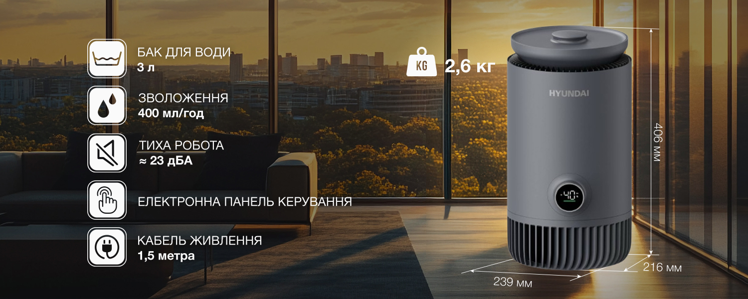 Незважаючи на свій компактний дизайн, HYUNDAI чудово справляється з фільтрацією повітря в оселі, забезпечуючи експертні результати очищення. А це: